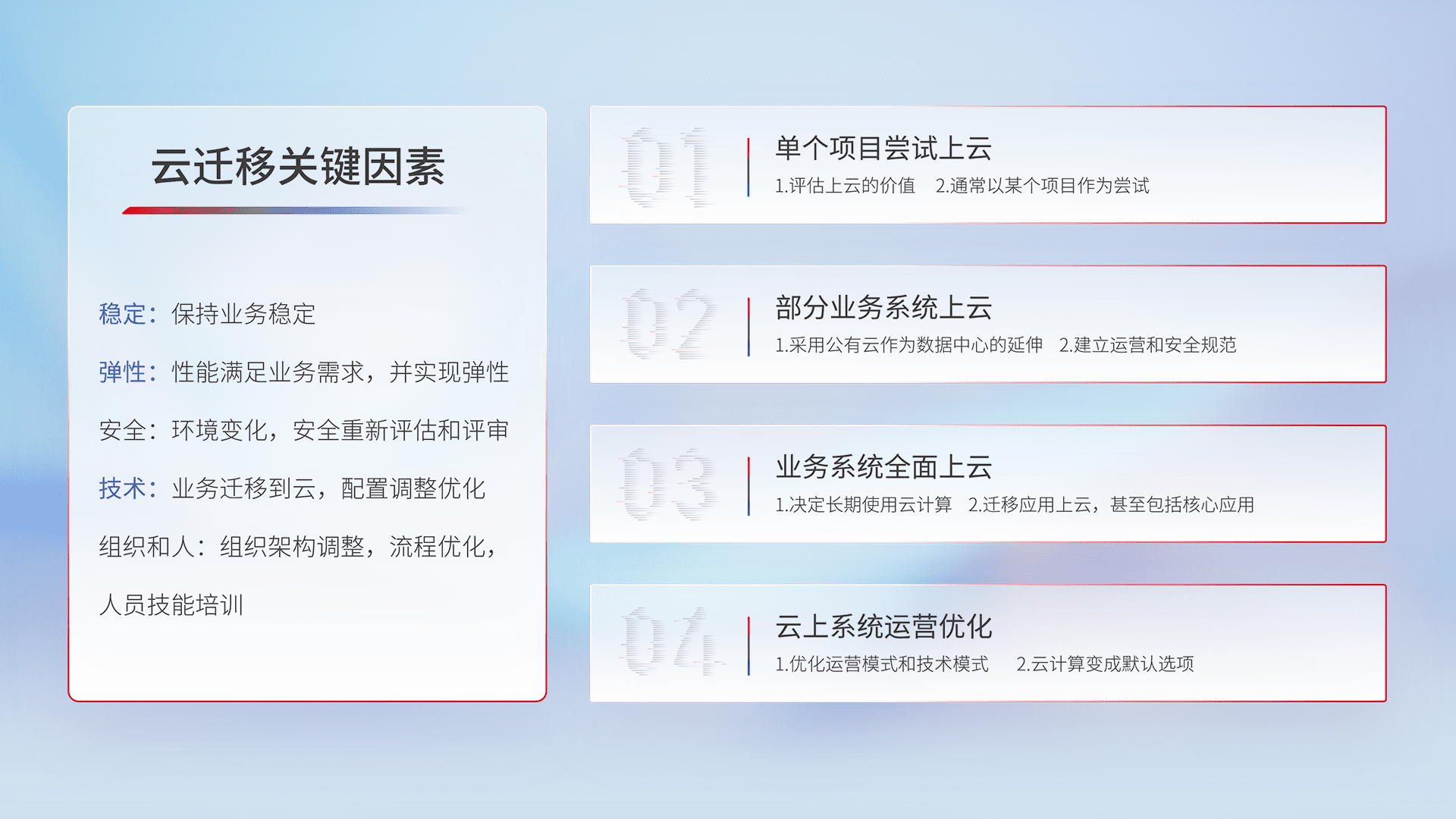 结合实际业务,,,,从规划设计、、、、云平台选型、、云原生改造、、、、数据迁移、、、、集成交付,,迁移全过程为客户识别最佳上云路径,,,,做好风险识别管理,,,,设计网络架构、、、、身份权限、、安全审计合规、、、、操作审计、、日志审计、、、监控告警策略、、多站点容灾设计等,,,对云上基础设施进行整体规划,,,提升IT治理水平,,,,以满足弹性、、、、高可用、、、高性能的需求。。。