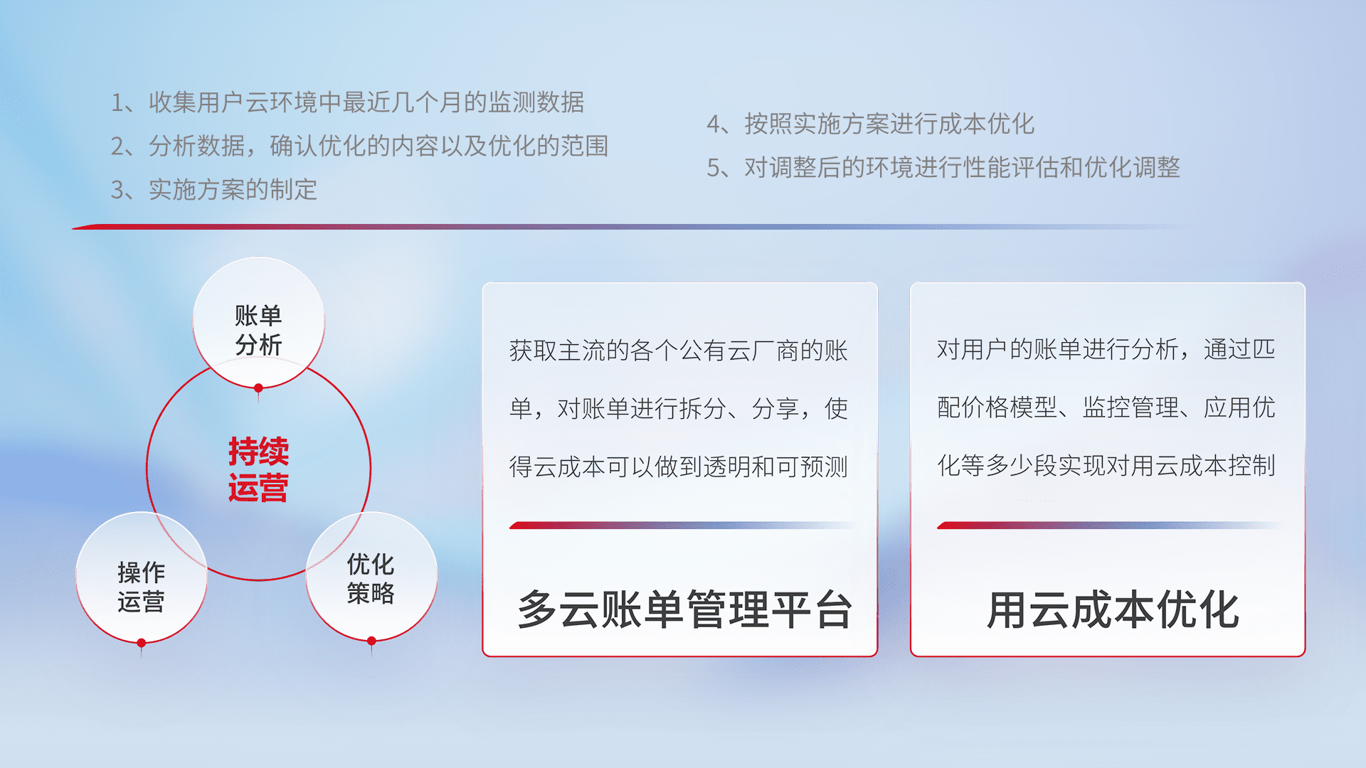 通过多云纳管,,,以统一的资源数据模型把客户的云资源进行抽象和封装,,进而实现对多云资源的统一操作,,,,保障云资源管理的可靠性、、、稳定性与可用性。。。。量身定制化运维内容,,,配置、、开发运维、、补丁管理、、、备份、、、监控、、、认证和访问管理、、、、审计和日常巡检等,,,保障在用云过程中的可靠度,,,,稳定度以及高可用率。。。